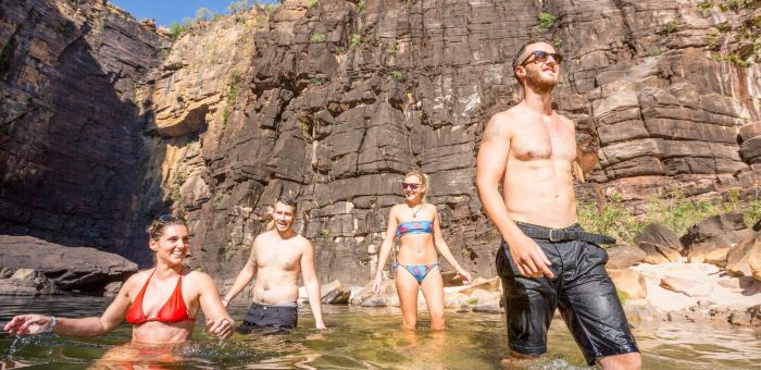 This morning the jewels of Kakadu National Park await. After breakfast and departing camp we travel off road to the majestic Twin and Jim Jim Falls* for a day of adventure and exploration. Travelling into Twin Falls by 4WD track, a boat shuttle and finally a rocky track and boardwalk, we will be rewarded by the beauty of this remote waterfall deep within Kakadu National Park. Afterwards we stay off the beaten track where a walk through monsoon forests and over boulders leads us to Jim Jim Falls. Surrounded by 150 metre cliffs, we spend some time soaking up the natural beauty of this majestic location. This afternoon we depart Kakadu National Park and travel towards Litchfield National Park where we will stop along the way at our private campsite. Tonight, enjoy a hearty meal with your fellow adventurers.