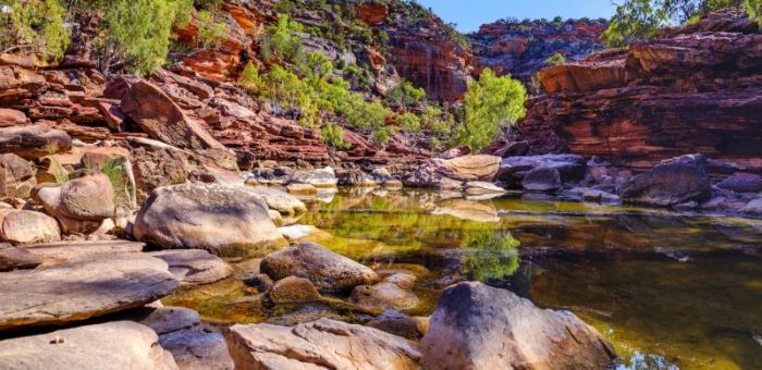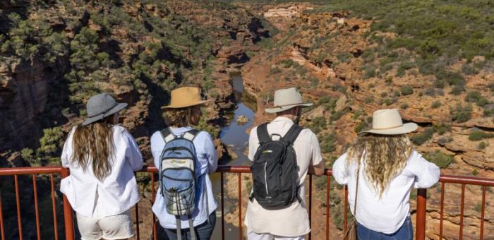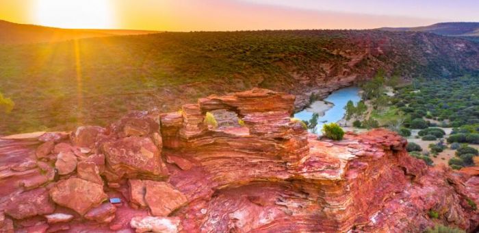 Our coastal loop adventure begins with a walk along the stunning Greenhead Three Bays Walks. After lunch at Dynamite Bay, part of the Three Bays Walk, we travel up Indian Ocean Drive for some stunning coastal views. On the way to Geraldton, we stop at the Hutt Lagoon Pink Lake, a must-see attraction just outside of town. Then it's on to the stunning coast of Kalbarri at the Natural Bridge and then we take a leisurely walk along Castle Cove. Enjoy an overnight stay in the sleepy seaside town of Kalbarri, where the Murchison River flows out into the Indian Ocean. Meals: n/a. Accom: Kalbarri Edge Resort Private Studio Rooms (with ensuite) or Twin Share (with shared facilities) or similar alternative. Driving Distance: 575km. Hike Distance: 2km.