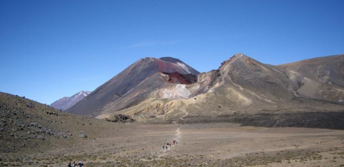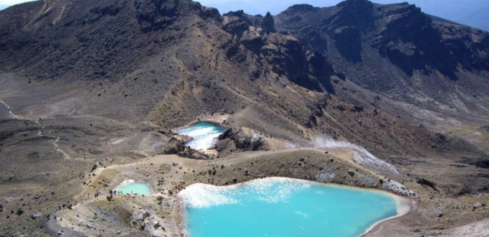 The track leads up to the saddle between Mt Ngauruhoe and Mt Tongariro and then diverts over Mt Tongariro. Mt Tongariro is not a single volcano, but a complex of craters that have been active at different periods. The landscape on Tongariro is peppered with the different colouredand shaped craters, scoured volcanic rocks, mountain springs, and brightly colouredemerald lakes.