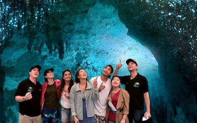 Waitomo Caves – Arriving at our second feature attraction you will be guided through the ancient and amazing caves seeing many different cave formations, including Stalactites, Stalagmites and Lime Columns, before descending even further underground for your Glowworm experience. Board your boat for a cruise on the grotto river with thousands of Glowworms sparkling above you. Unique to New Zealand for over 120 years, Waitomo Glowworm Caves are a must see for any traveller.