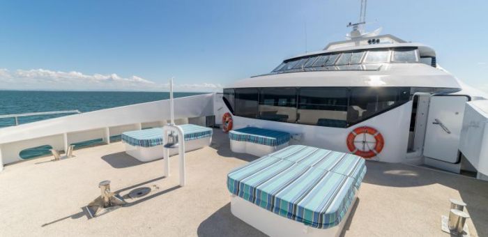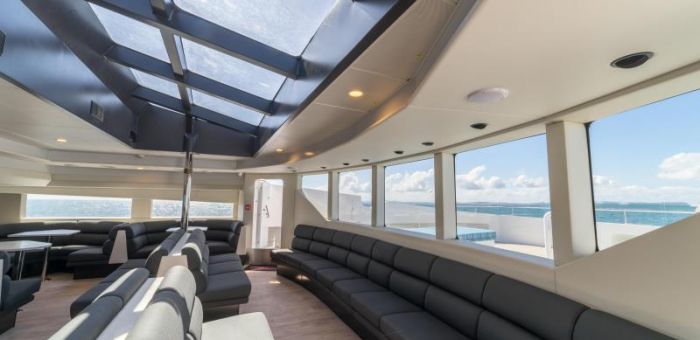 Passengers can relax and enjoy the comfortable booth seating, ambient décor and no matter where they are they won’t miss a thing with high definition cameras projecting live outdoor footage onto TV screens throughout the vessel.