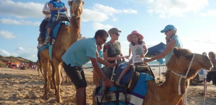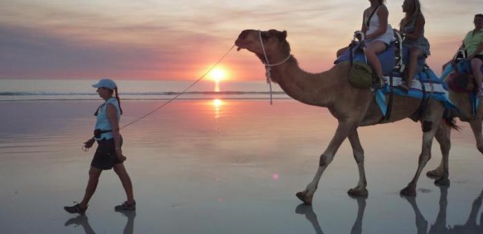 Meet us at the time of your tour north of the rocks on Cable Beach. Head down the vehicle access ramp in front of the Cable Beach Club Resort and Spa. Once on the beach, turn to the right and head through the rocky outcrop. Look for the blue tent and the camels wearing blue blankets!